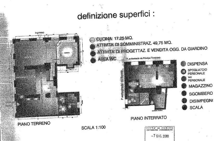 - piano terra: ingresso principale da via Principe Tommaso 22 su prima sala di somministrazione con bancone bar, una completa ed attrezzata cucina separata, corridoio di passaggio con bancone, seconda sala di somministrazione con bancone aperitivi, terza sala di somministrazione con ingresso per disabili da via Baretti, doppi servizi per clienti (a norma per disabili), scala interna di discesa al piano interrato.