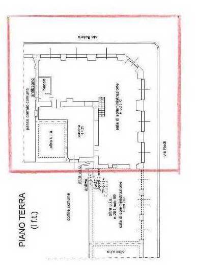 Il locale commerciale (già ex pizzeria/ristorante) è composto da un piano terra e da un piano interrato comunicante con altra proprietà adiacente che a sua volta si sviluppa su tre piani.