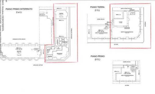 Il locale al piano terra ha 7 vetrine e comunica con l'altra proprietà attraverso l'apertura indicata sul lato via Rodi con tre vetrine.