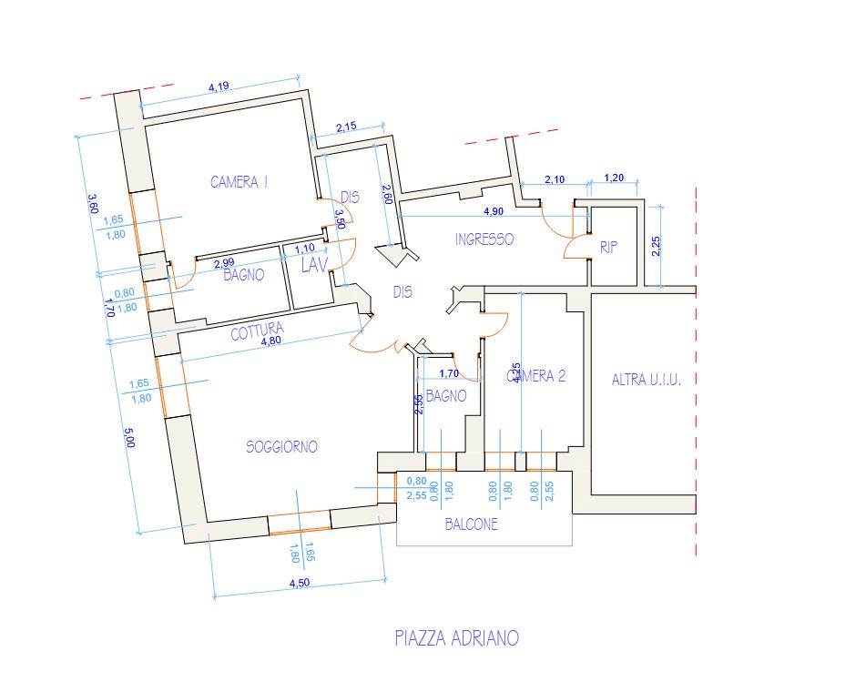 Ingresso su ampio disimpegno con ripostiglio attrezzato, corridoio di disimpegno con una camera da letto padronale con un bagno privato dotato di moderno impianto doccia; un vano ad uso lavanderia con possibilità di lavatoio, una grande zona giorno adibita a salotto e zona pranzo con parete attrezzata per una funzionale cucina living ed uscita su profondo balcone con vista sulla Piazza Adriano e sulla collina torinese; altro disimpegno con secondo bagno attrezzato con doccia e seconda camera da letto con uscita su balcone.